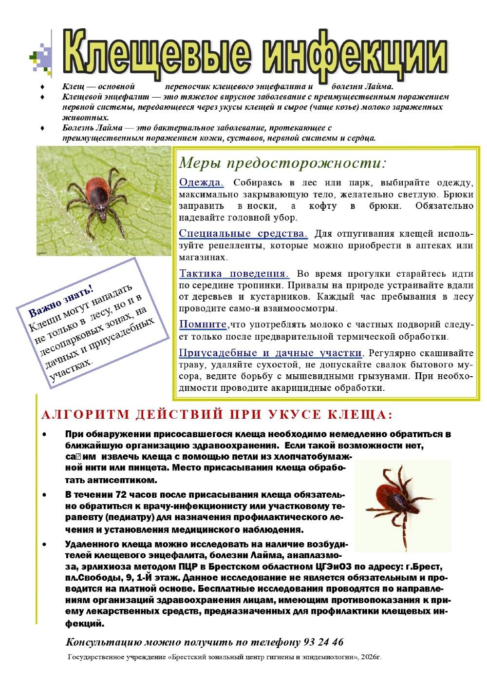 По вопросам профилактики клещевых инфекций и защиты от клещей Вы можете обращаться в Брестский зональный центр гигиены и эпидемиологии т. 93 24 46.