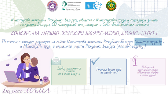 Министерство экономики совместно с Белорусским союзом женщин и ОАО «Белинвестбанк» при поддержке Министерства труда и социальной защиты объявляет о старте конкурса на лучшую бизнес-идею, бизнес-проект «БизнесМАМА».